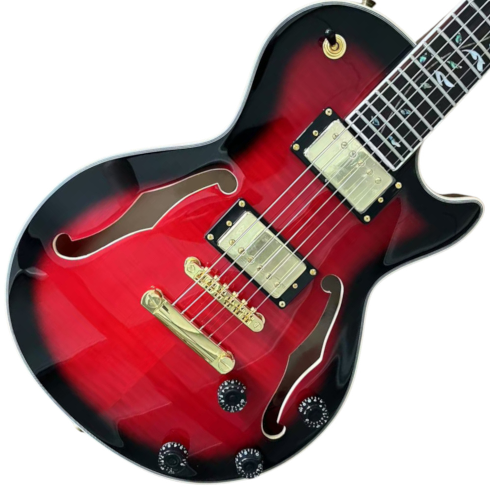 With a Mahogany Semi Hollow Body with a Maple Top, Set Neck with a chunky Vintage C profile, Rosewood Fretboard adorned with real Pearl / Abalone “Tree of Knowledge”™ Inlays, and Multiply Binding to the Body, Fretboard and Headstock, the first sight of this Guitar will take your breath away.