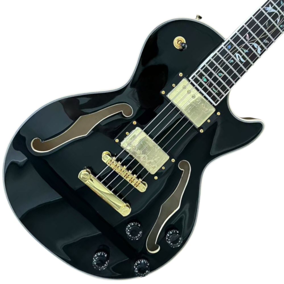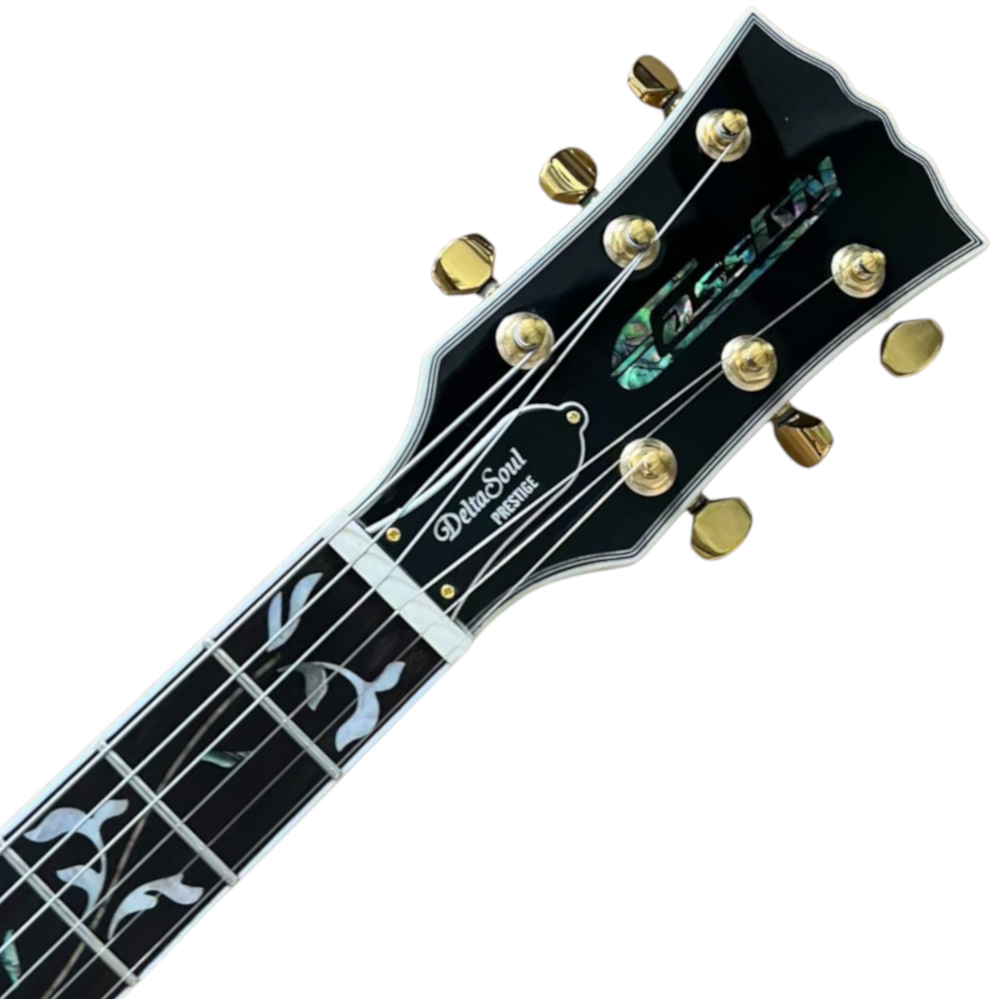 With a Mahogany Semi Hollow Body with a Maple Top, Set Neck with a chunky Vintage C profile, Rosewood Fretboard adorned with real Pearl / Abalone “Tree of Knowledge”™ Inlays, and Multiply Binding to the Body, Fretboard and Headstock, the first sight of this Guitar will take your breath away.